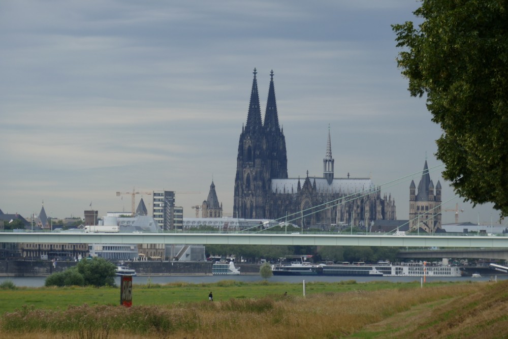 Aber nun der Reihe nach. Während wir die letzten Tage seit Ingelheim, wo wir am ersten Tag von der rechten Rheinseite auf die linke gewechselt sind, immer linksrheinisch unterwegs waren – mit Ausnahme unseres Besuch bei Carola und Dirk, die auch auf der rechten Rheinseite wohnen – haben wir heute mehrmals die Seiten gewechselt. Das erste Mal heute morgen gleich am Anfang, um einen großen petrochemischen Komplex zu vermeiden, den wir sonst großräumig hatten umfahren müssen. So sind wir also auf der rechten Seite an Köln vorbei gefahren, so dass wir einen schönen Blick auf die Altstadt hatten.