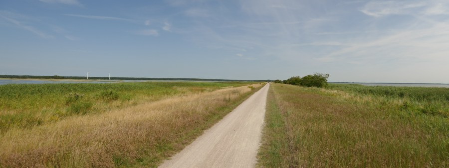Heute konnten wir zu unserer Rubrik „wirre Umleitungen“ wieder ein Beispiel hinzufügen. In Wolgast war der Radweg auf der einen Seite der Peenebrücke gesperrt, weswegen der Radverkehr auf der anderen Seite entlang geleitet wurde. Leider war das erste Umleitungsschild so unklar, dass wir erst einmal falsch fuhren, dann aber die richtige Umleitung fanden, die aber plötzlich vor einer Treppe auf die Brücke endete. Wir mussten also unsere Räder allen Ernstes mit Gepäck die Treppe hochtragen. Ich frage mich, wie das andere Leute machen sollen, die vielleicht noch mit schweren E-Bikes unterwegs sind und nicht mehr so viel Kraft haben, ein Rad eine Treppe hochzutragen. Da hätte sich bestimmt auch eine bessere Lösung finden lassen. Wir trugen also unsere Räder die Treppe hoch, fuhren über die Brücke und waren dann auf Usedom.