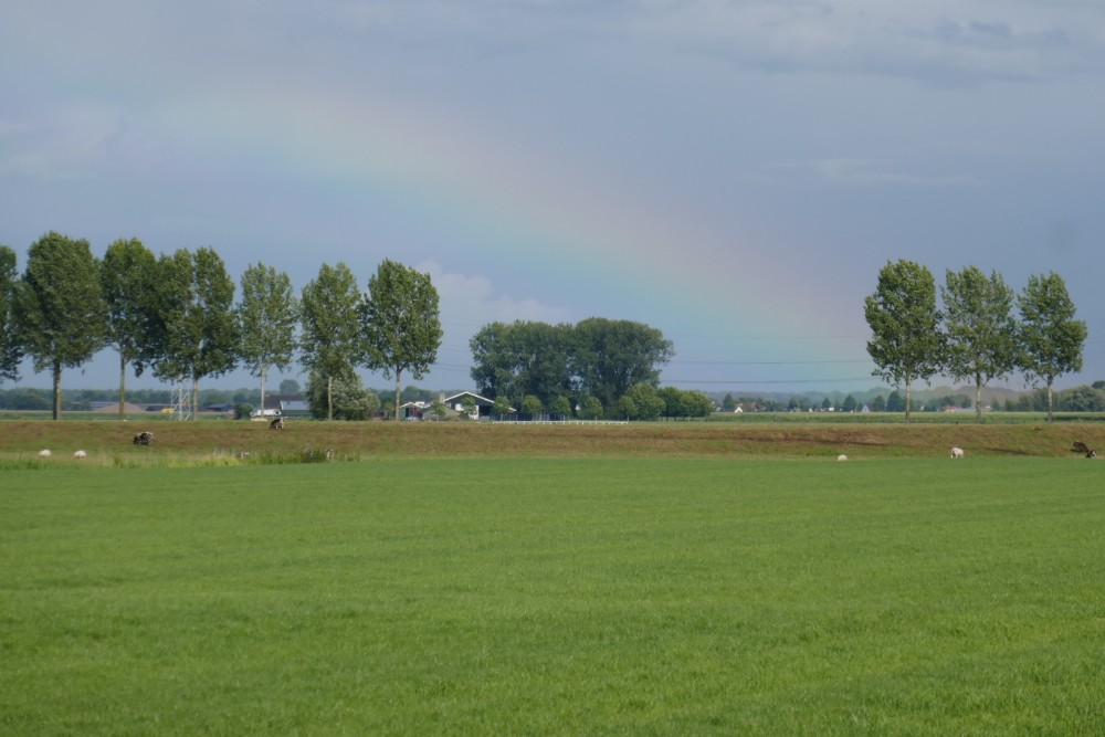 Aber zurück zu unserer Fahrt gestern. Nach einigen Irritationen bezüglich der zu fahrendem Strecke, fanden wir dann doch einen Weg, der uns zuerst wie gestern am Ende auch schon am Lingedamm entlang führte. Er führte durch eine Landschaft, die ich, wie die auch gestern Morgen schon, in den Niederlanden nicht erwartet habe. Denn entgegen dem Klischee, dass in den Niederlanden nur geschmacklose Tomaten in Gewächshäusern und Tulpen angebaut werden, fuhren wir durch riesige Birnen-, Apfel- und Kirchbaumplantagen. Und die sind, zumindest dem hauseigenen Apfelsaft, den wir in unserem Quartier auf dem Obsthof getrunken haben, nach zu schließen, alles andere als geschmacklos.